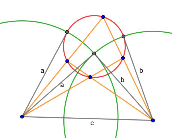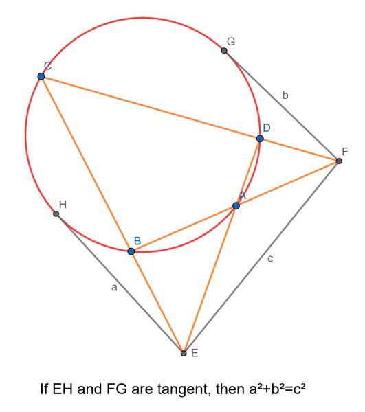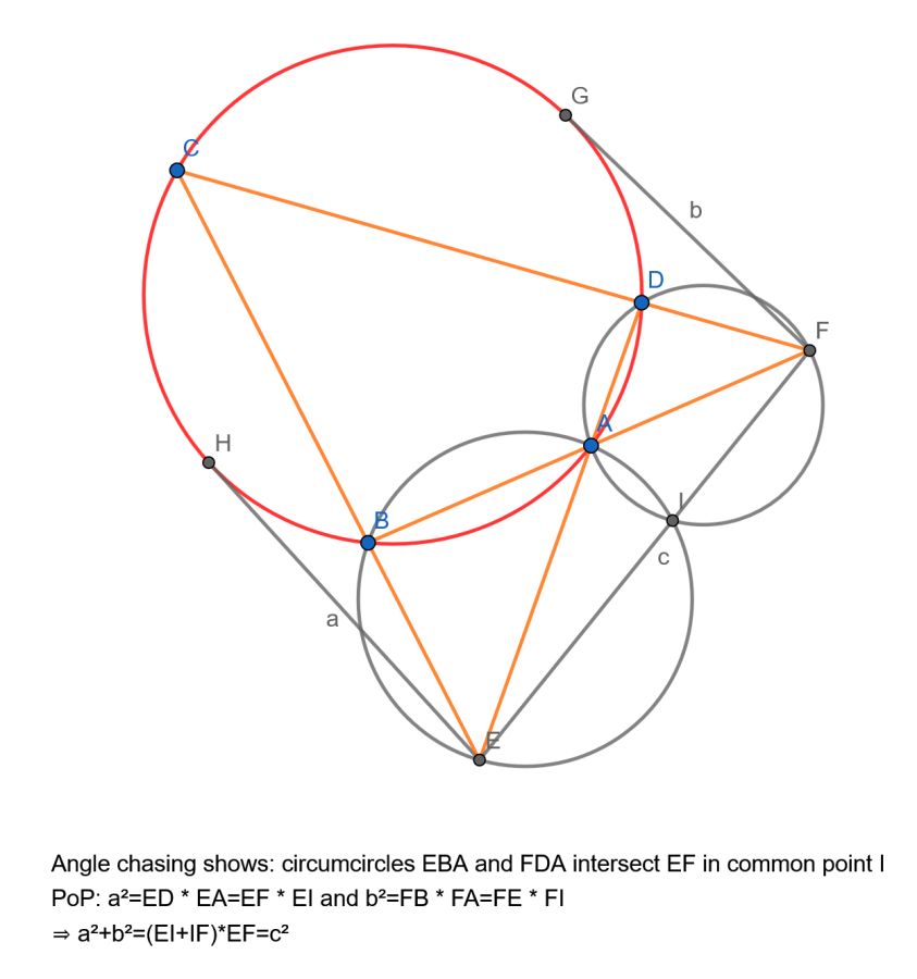 Using the cyclic quadrilateral lemma, we have a2+b2=c2. So the radii of the green circles to their intersection point are orthogonal.
